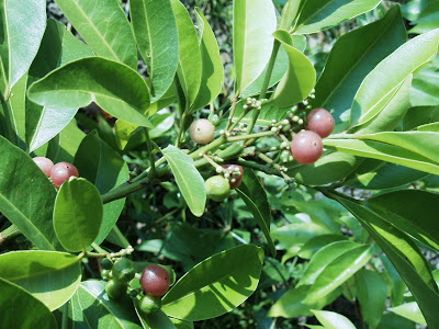 Gin-berry grows only about 10-12 feet tall, and the trunks never get more than about 1½ inches in diameter. Here's a row of plants that are about 20 years old: